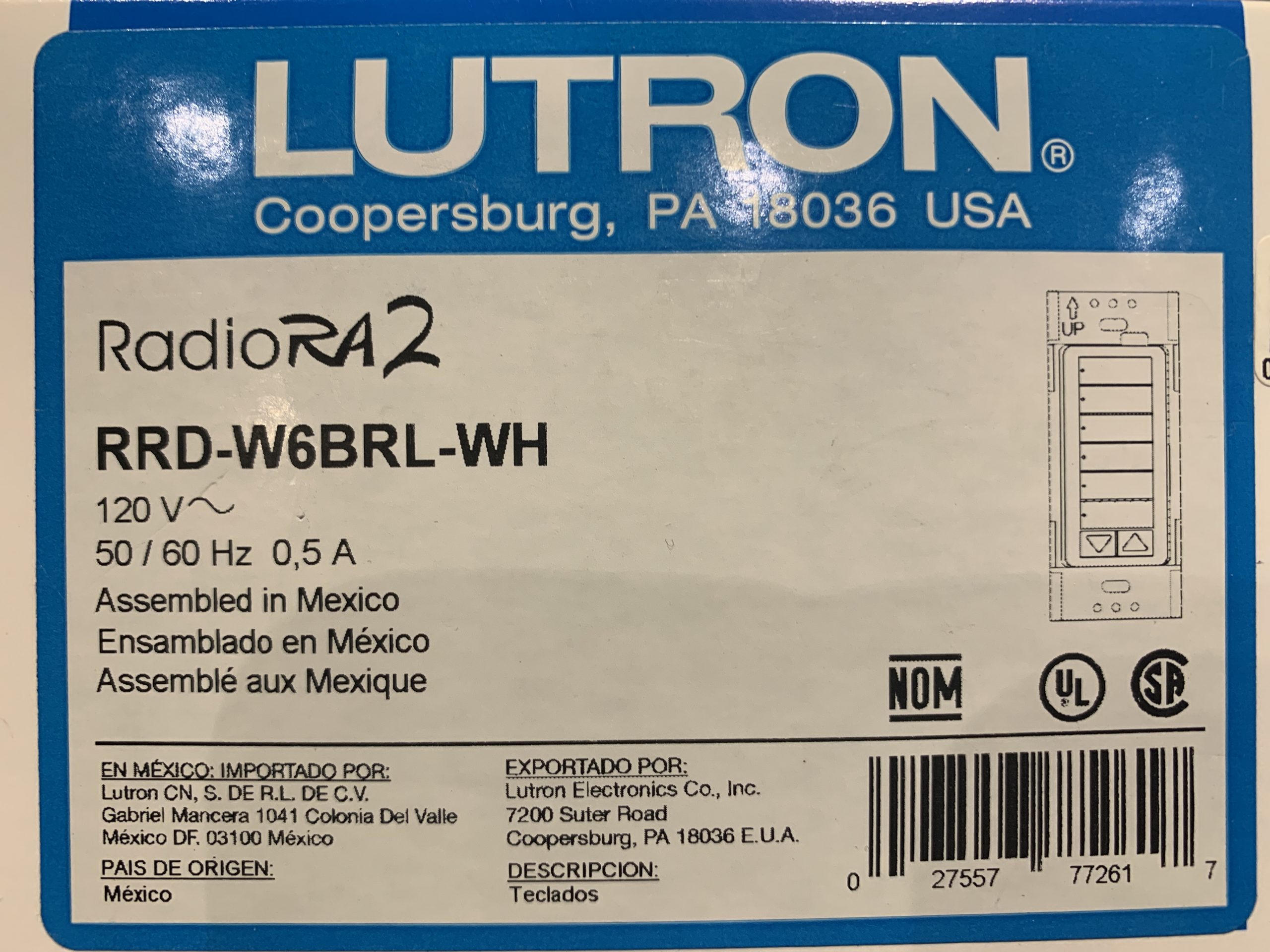 Lutron RadioRA 2 and 3 RF Keypad 6 Button Raise/Lower RRD-W6BRL-WH. Wall mounted keypad that requires constant power. In original box never installed.