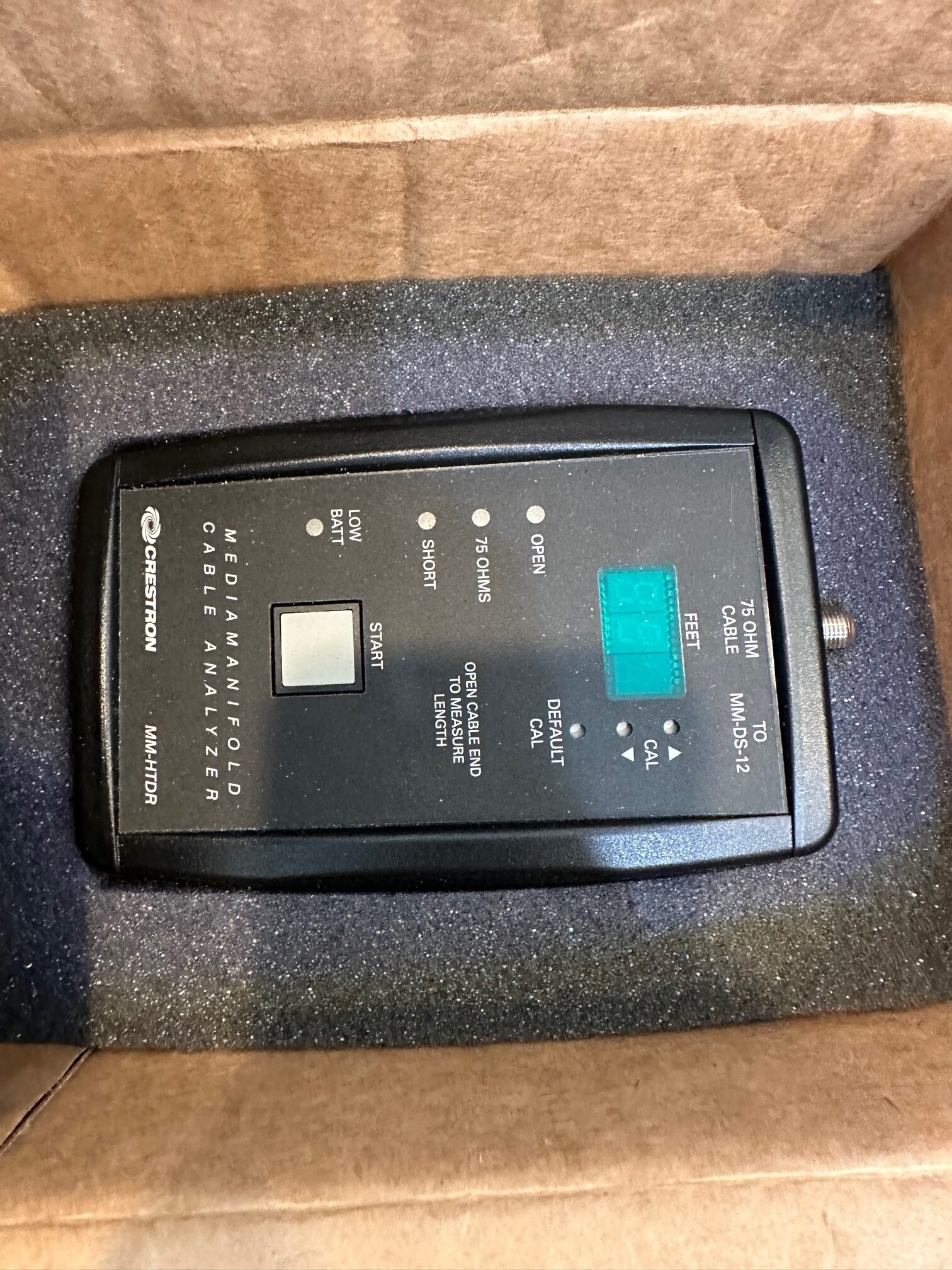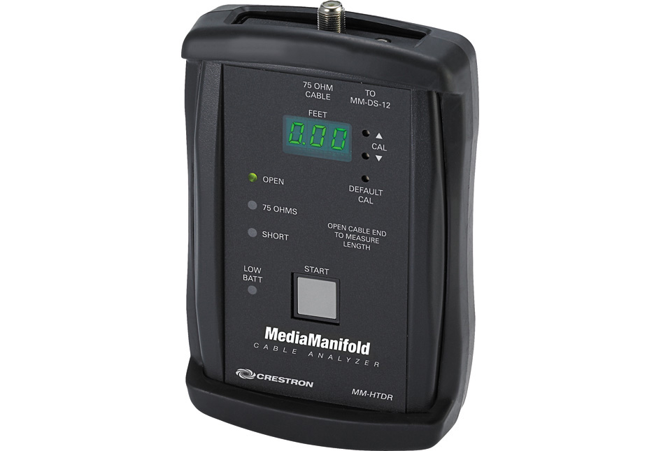 The Crestron MM-HTDR MediaManifold™ Cable Analyzer is a portable handheld device used to determine the length and integrity of RG6 cable runs. Using “time domain reflectometry,” the MM-HTDR can measure cable lengths up to 1099 feet. When used in conjunction with the MM-DS-12 MediaManifold CATV Distribution System, the MM-HTDR can be used to set the optimum gain and tilt settings for each zone based on the length measured (up to 300 feet maximum). The MM-HTDR can also be used to determine if a cable is shorted. Single-button operation makes it simple to set up a complete MediaManifold system.